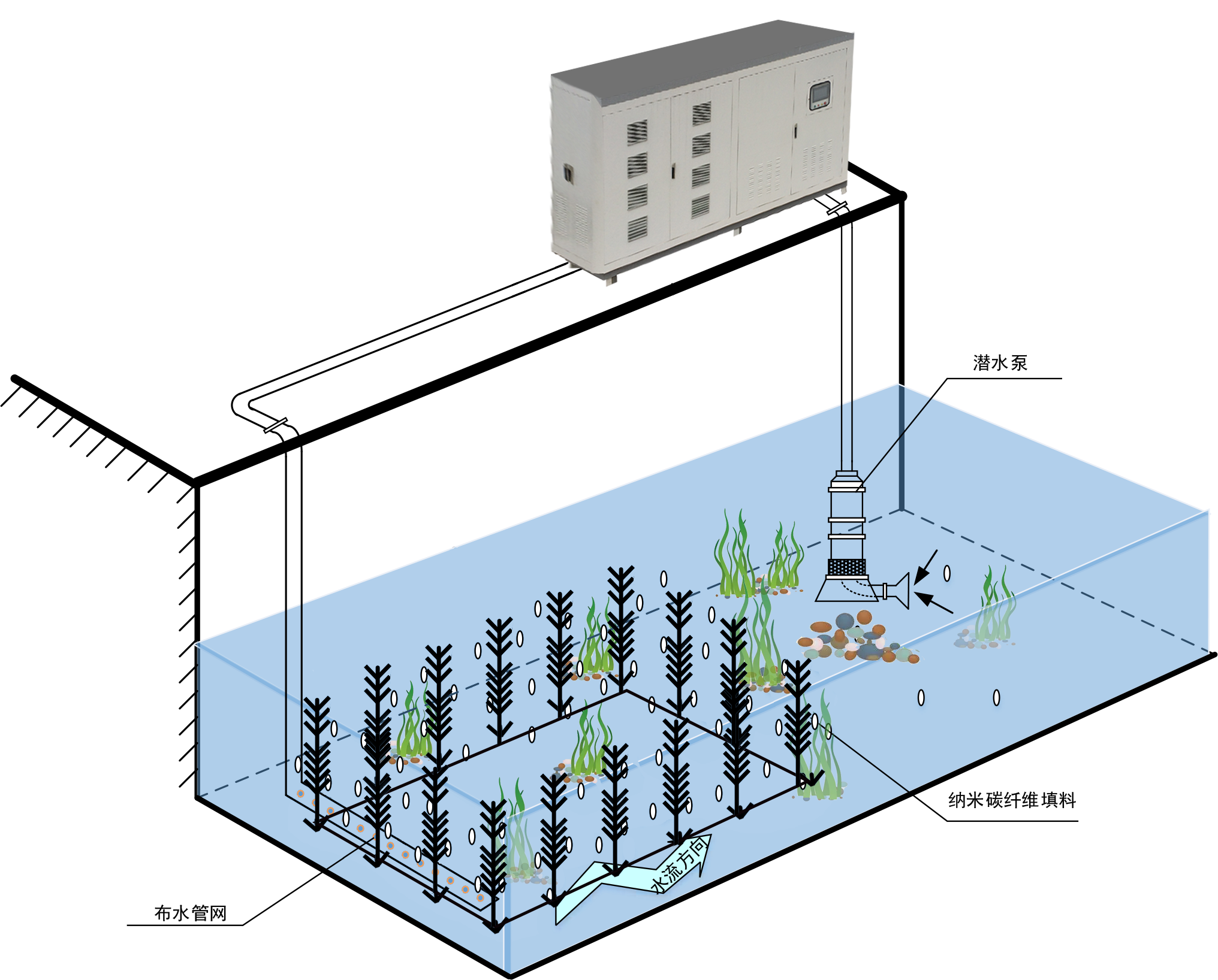 高效富氧生物技術(shù)結(jié)合納米碳纖維載體,為各種類型的微生物的高效繁殖提供有效的附著空間,快速形成生物膜。載體表面形成的生物膜以污水中的有機(jī)物為食料加以吸收、同化,高效生物浮床可以有效的發(fā)揮水生植物凈化與微生物高效降解水體中污染的功能,對水體中N、P具有較強(qiáng)的凈化作用。此技術(shù)適用于水流流速較大,水位較深的非行洪中小河流。