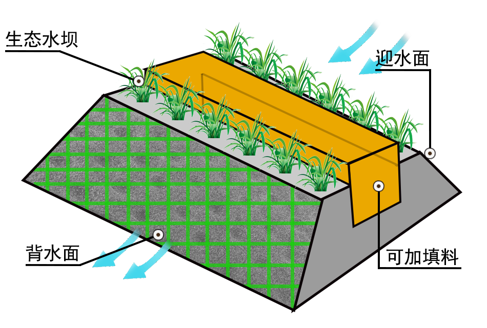 生態(tài)透水壩結(jié)合高效富氧生物技術(shù),水中污染物在物理沉降、自然降解、水生生物吸收的作用下,凈化水質(zhì)。生態(tài)透水壩利用物理過濾、植物吸收和微生物降解。物理過濾在于堆積壩體的濾料之中形成許多空隙,污水在經(jīng)過生態(tài)透水壩時(shí),水中的污染物被吸附和攔截下來。生態(tài)透水壩上種植的水生植物產(chǎn)生的大量根系深入壩體,吸收水中的營養(yǎng)鹽和重金屬。許多微生物和原生動物生長于濾料中,它們利用污水中的營養(yǎng)物質(zhì)生存和繁殖,進(jìn)而凈化了水質(zhì)。適用于流速緩慢、污染嚴(yán)重的非行洪中小河流。
