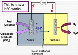 燃料在細(xì)菌的催化作用下于陽(yáng)極室被氧化,產(chǎn)生的電子通過位于細(xì)胞外摸的電子載體(例如,細(xì)胞色素)傳遞到陽(yáng)極,再經(jīng)外電路到達(dá)陰極,質(zhì)子通過質(zhì)子交換膜到達(dá)陰極。氧化劑(一般為氧氣)在陰極室得到電子被還原。