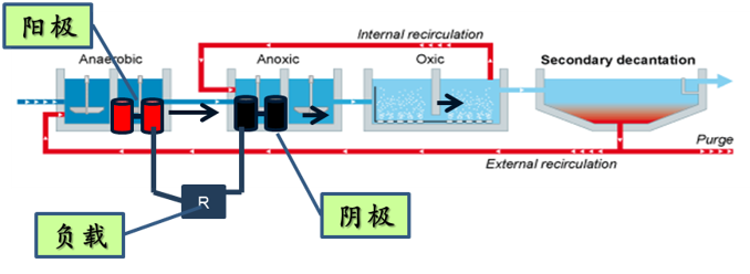 MFC同步的脫氮除碳—陽(yáng)極利用微生物去除有機(jī)物產(chǎn)生電子,同時(shí)在陰極(生物陰極)利用硝酸鹽還原菌催化硝酸鹽還原,從而實(shí)現(xiàn)在去除有機(jī)物的同時(shí),脫去污水中的氮。